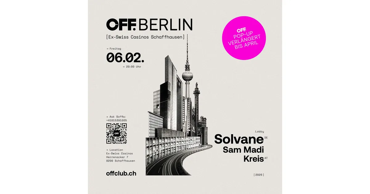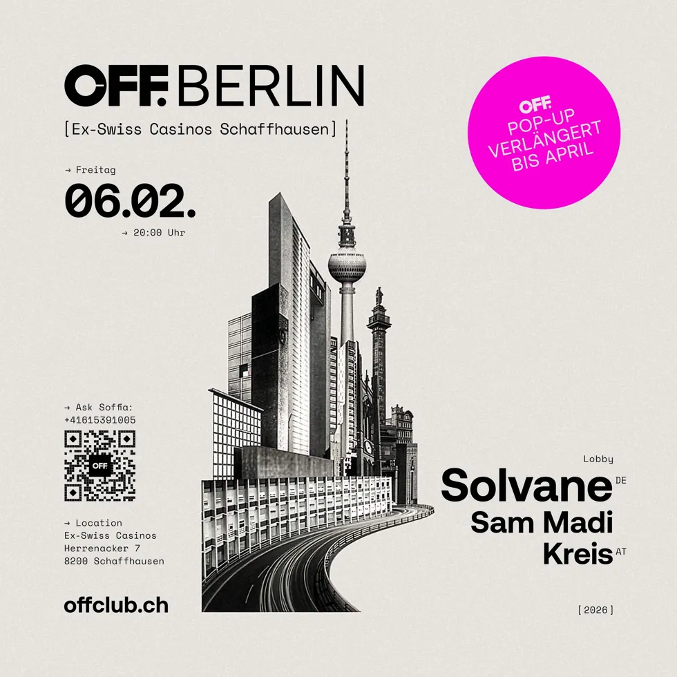 Es geht weiter: Der OFF Pop-up Club bleibt bis April 2026 am Herrenacker 7 in Schaffhausen. Nach einem ausgiebig zelebrierten Dezember und Januar legen wir direkt mit einem Highlight nach dem anderen nach. Zum Auftakt der Verlängerung holen wir am Freitag, dem 6. Februar 2026, Solvane aus dem legendären Ritter Butzke in Berlin ins OFF. Und als wäre das nicht schon genug, gesellen sich Sam Madi und Kreis aus Österreich ebenfalls zum Line-up. Freut euch auf einen Freitag voller Energie, Liebe und guter Musik!
