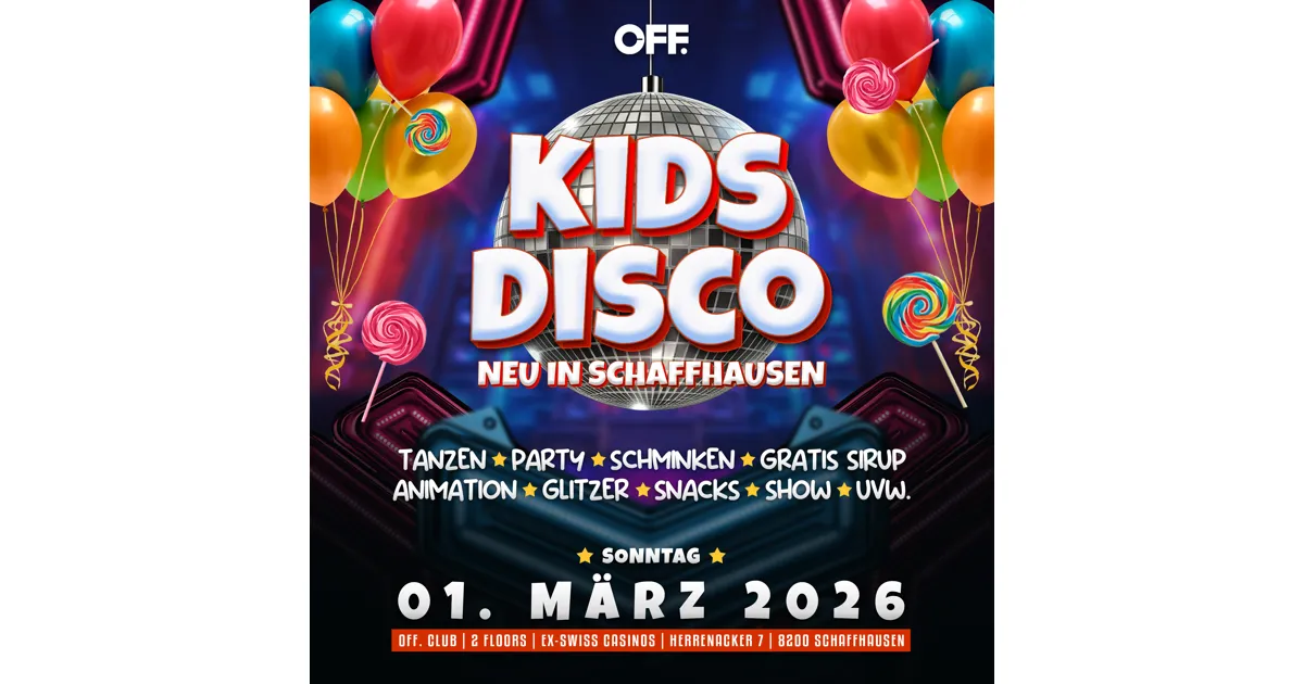 Nach zwei ausverkauften Kids Discos ist klar: Die erfolgreichste Kinderdisco der Schweiz macht erneut Halt in Schaffhausen. Am Sonntag, dem 1. März 2026, verwandelt sie ab 14 Uhr erneut den OFF. Pop-up-Club im ehemaligen Swiss Casinos Schaffhausen in eine bunte Mini-Disco. Es erwartet euch eine farbenfrohe, familienfreundliche Mini-Disco mit den besten Kinderhits in angenehmer Lautstärke. Ein Animationsteam sorgt mit tollen Aktivitäten wie Kinderschminken, Tanzspielen, Snacks und vielen Überraschungen für strahlende Kinderaugen. Erlebt besondere Familienmomente im wohl aussergewöhnlichsten Pop-up-Club der Stadt! Für alle gibt es kostenlos Popcorn und Kindersirup, so viel das Herz begehrt.