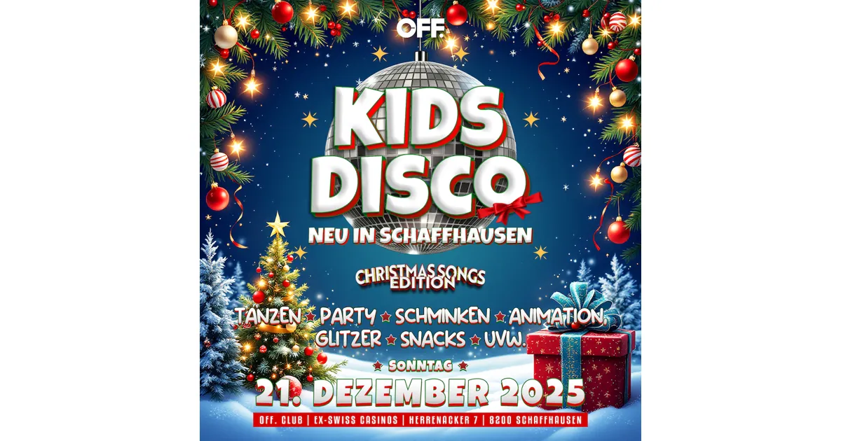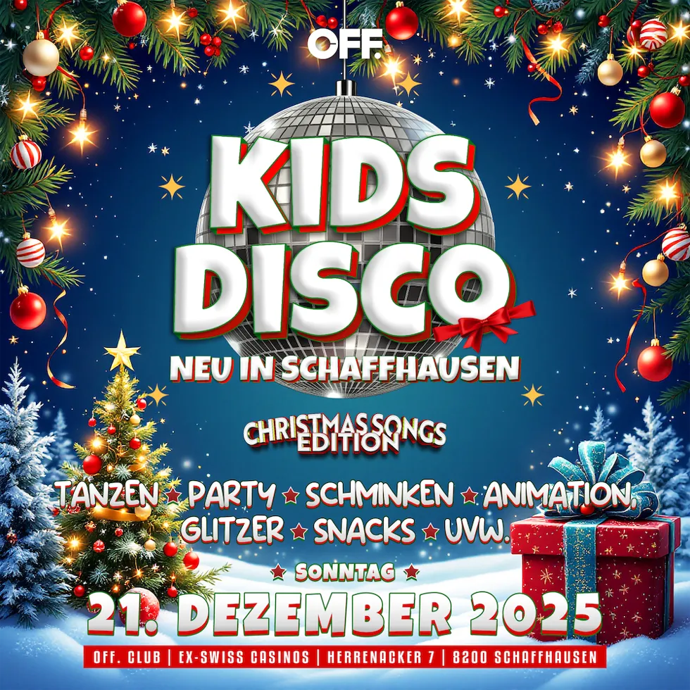 Die wohl erfolgreichste Kinderdisco der Schweiz ist auf Tour und besucht uns am Sonntag, dem 21. Dezember 2025, von 14:00 bis 18:00 Uhr im OFF Pop-up-Club auf dem Herrenacker 7, in den Räumlichkeiten des ehemaligen Swiss Casinos Schaffhausen. Unsere Lobby verwandelt sich in eine farbenfrohe, familienfreundliche Mini-Disco mit weihnachtlichen Kinderhits in angenehmer Lautstärke. Ein Animationsteam sorgt mit tollen Aktivitäten wie Kinderschminken, Tanzspielen, Snacks und vielen Überraschungen für strahlende Kinderaugen. Erlebt besondere Familienmomente im wohl aussergewöhnlichsten Pop-up-Club der Stadt!