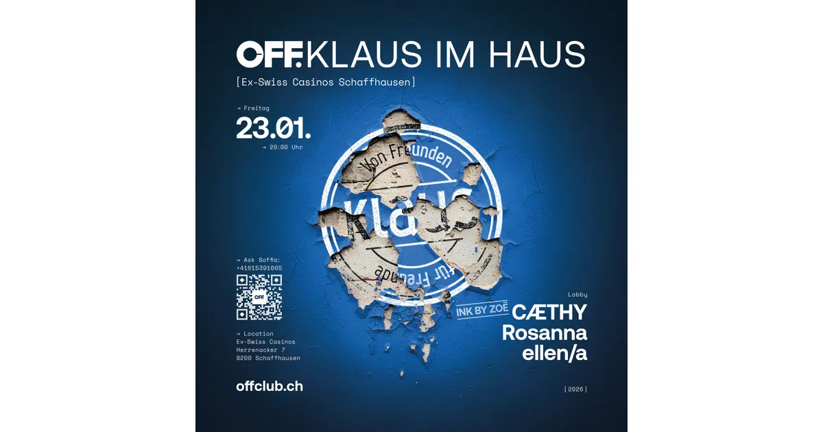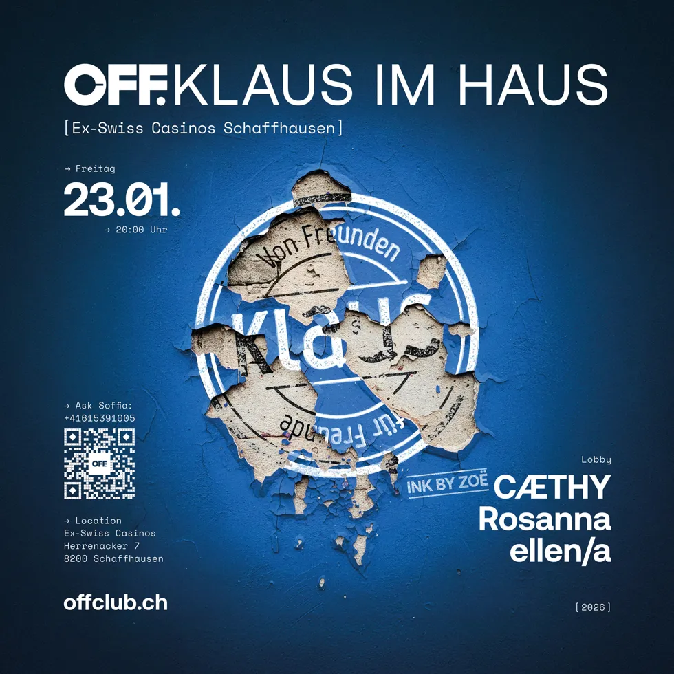 Am Freitag, dem 23. Januar 2026, zieht für eine Nacht das Flair der Langstrasse Zürich ins OFF ein. Der renommierte Zürcher Club Klaus reist mit seiner gesamten Crew an und bringt seinen einzigartigen Klaus-Vibe nach Schaffhausen. Das Besondere an diesem Abend: Das DJ-Line-up gehört ganz den Frauen. Mit CÆTHY, Rosanna und ellen/a übernehmen drei starke Künstlerinnen das musikalische Ruder – voller Empowerment. Für alle, die unser OFF.-Logo unter die Haut gehen lassen wollen: Tätowiererin Zoë sticht euch an diesem Abend live vor Ort Tattoos, das OFF.-Logo sogar kostenlos. Die Veranstaltung beginnt um 20 Uhr im ehemaligen Swiss Casinos, Herrenacker 7, in Schaffhausen.