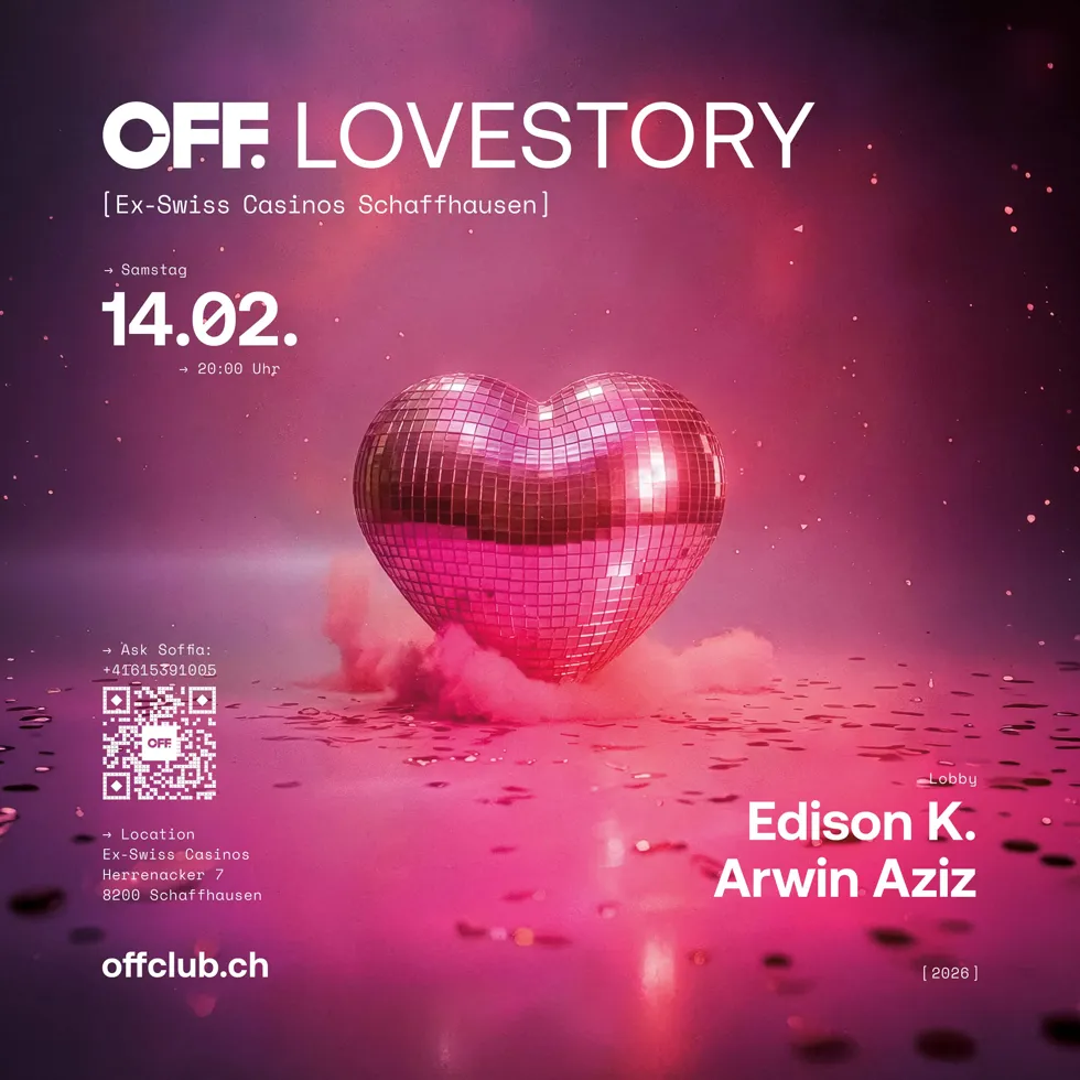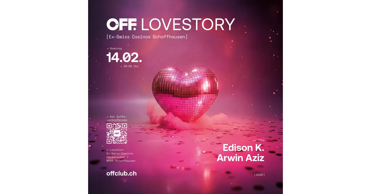 Unsere Liebe ist unzertrennlich. Wir lieben dich über alles und das wollen wir dir einfach auch mal zeigen. Deshalb laden wir euch alle ein, mit uns am 14. Februar 2026 unsere eigene Off-Love-Story zu schreiben. Lass dich überraschen! Es erwarten dich einige Highlights und vor allem sehr viel Liebe mit den DJs Edison K. und Arwin Aziz. Lasst uns gemeinsam im ehemaligen Swiss Casinos am Herrenacker 7 in Schaffhausen die Nacht zum Tag machen!