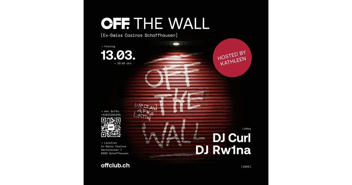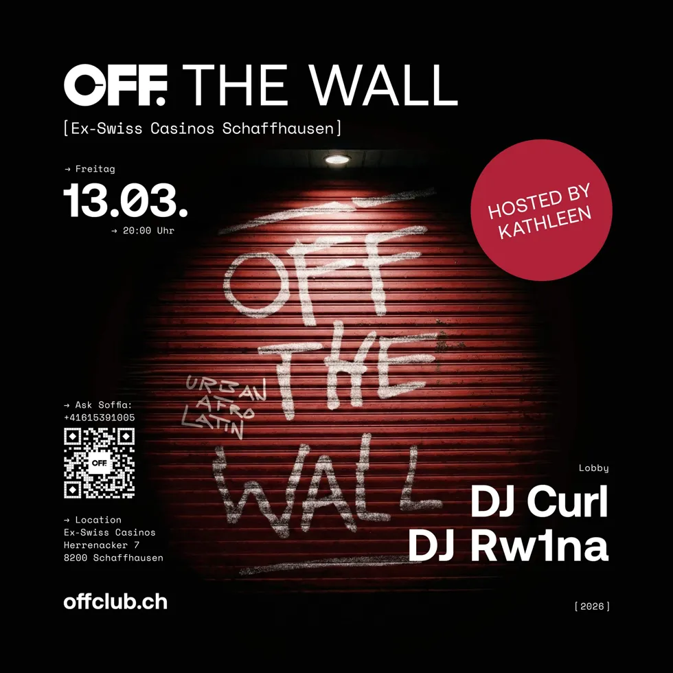 Am Freitag, dem 13. März 2026, erwartet euch im „OFF.“ Pop-up-Club eine aussergewöhnliche Nacht voller Urban-, Afro- und Latin-Beats – ganz nach dem Motto „OFF. the Wall”. Die DJs Curl und Rw1na, wahre Meister ihres Fachs, werden den Abend mit viel Liebe zum Detail und Rhythmus im Blut gestalten. Euer Host an diesem Abend ist die einzigartige Kathleen, die dafür bekannt ist, ihre Crowd mitzureissen und für ein unvergessliches Erlebnis zu sorgen. Kommt vorbei, lasst euch treiben und geniesst ein besonderes Beisammensein im ehemaligen Swiss Casinos am Herrenacker 7 in Schaffhausen.
