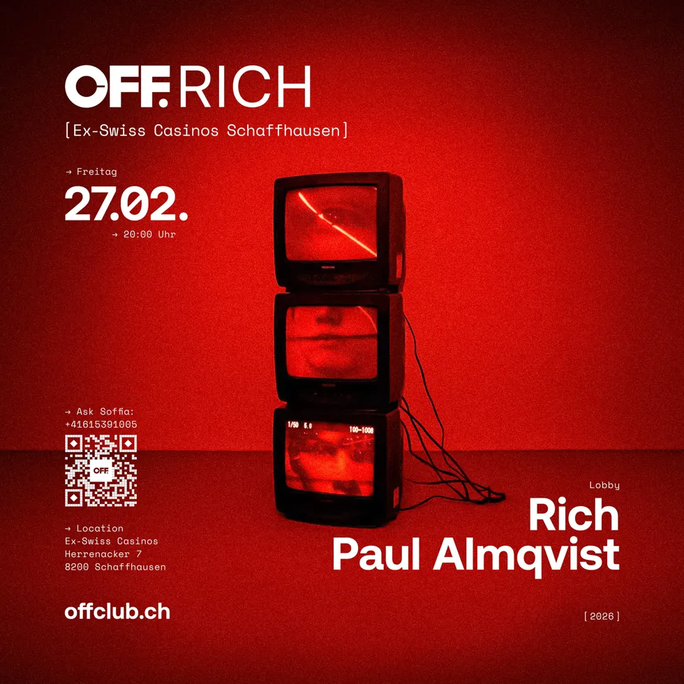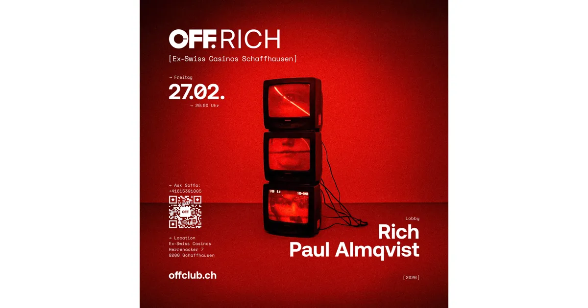 Am Freitag, dem 27. Februar 2026, wird DJ Rich uns alle Ehre machen. Er prägt seit geraumer Zeit die Ostschweizer House-Szene, und seine Veranstaltungen rund um Frauenfeld sind Kult und stets ausverkauft. An seiner Seite steht Paul Almqvist. Der gebürtige Deutsche lebt seit einiger Zeit in Zürich und weiss genau, welche Tracks auf der Tanzfläche zünden. Freut euch auf eine treibende Freitagnacht im OFF.-Pop-up-Club im ehemaligen Swiss Casinos auf dem Herrenacker 7 in Schaffhausen!