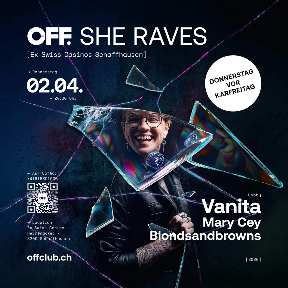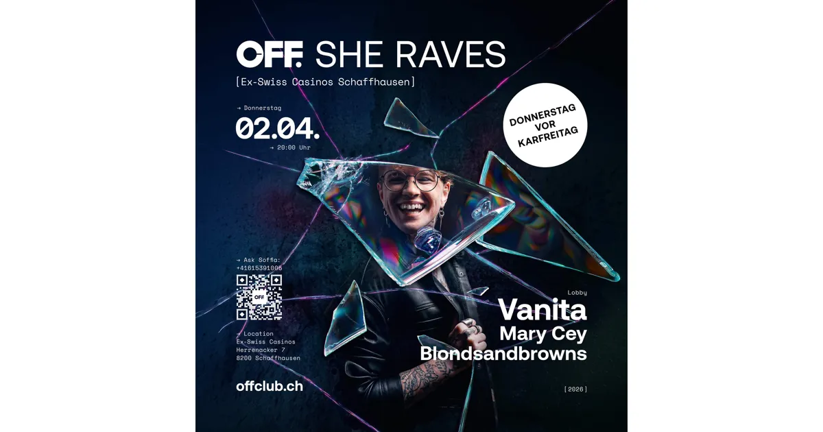 Am Gründonnerstag, dem 2. April 2026, wird die Nacht im „OFF.“ Pop-up-Club zum Raum für kollektive Energie, Empowerment und kompromisslosen Sound: Zum ersten Mal setzt ein reines Female-DJ-Line-up ein klares Zeichen für mehr Sichtbarkeit und Gleichberechtigung in der DJ-Szene. Mit Vanita, einer der bekanntesten She-DJs der Schweiz, Mary Cey und Blondsandbrowns treten drei prägende Acts auf, die für einen modernen, vielseitigen und kraftvollen Sound stehen. Dieser wird von einer offenen und respektvollen Community getragen und bietet im ehemaligen Swiss Casinos Schaffhausen am Herrenacker 7 viel Platz für die Liebe zur elektronischen Musik.