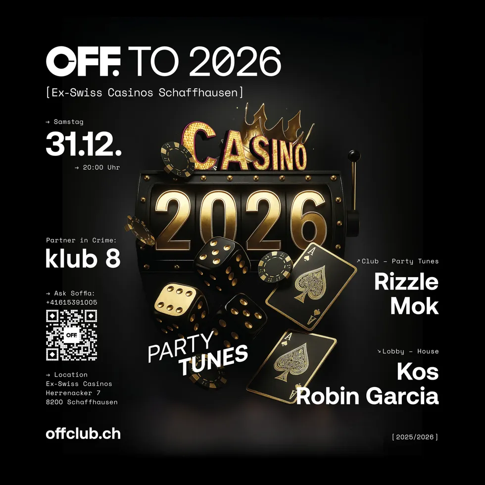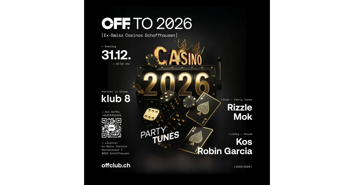 Goodbye Casino – Welcome 2026! Nach über 20 Jahren hat das Swiss Casinos Schaffhausen am Herrenacker 7 in diesem Jahr seine Türen geschlossen – ein perfekter Anlass, um gebührend Abschied vom alten Casino zu nehmen. Wo einst gezockt wurde, wird im OFF Pop-up-Club nun ins neue Jahr hineingefeiert. Freue dich auf einen stilvollen Abend voller Überraschungen und unvergesslicher Casino-Momente mit den besten Party-Tunes der letzten 20 Jahre, aufgelegt von den DJs Rizzle und Mok im Club, sowie den besten House-Hits von den DJs Kos und Robin Garcia in der Lobby. Erlebe eine einzigartige Silvesternacht auf zwei Etagen in einer einmaligen OFF-Location, die bald nur noch Erinnerung sein wird. Schreibe mit uns Geschichte und stosse mit uns gemeinsam auf das neue Jahr an! Diese Veranstaltung findet in Zusammenarbeit mit dem klub8 statt.