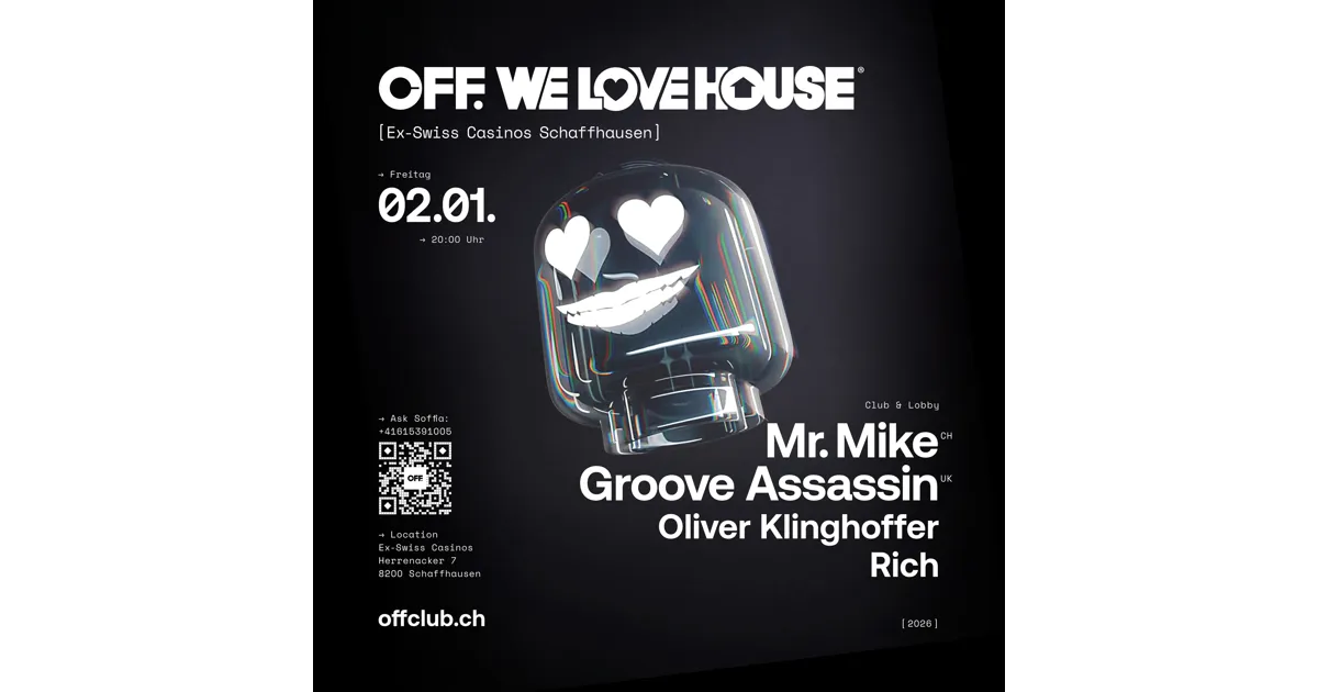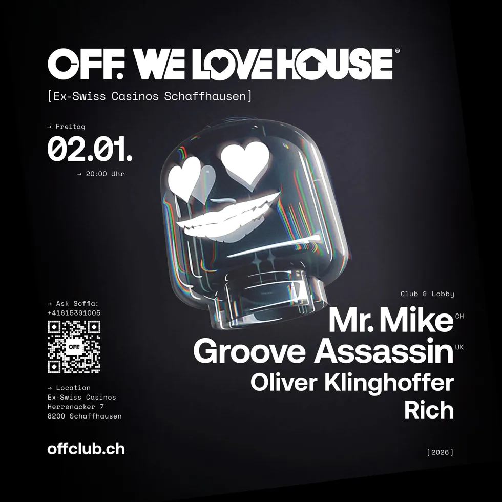 Gibt es etwas Schöneres, als das neue Jahr mit We Love House im OFF Pop-up-Club auf dem Herrenacker 7 in Schaffhausen zu beginnen? Diese Nacht ist ein Geschenk für alle House-Nostalgiker und Liebhaber echter Clubkultur. Im Zentrum steht Mr. Mike, Schweizer House-Legende, DJ und Gastgeber von We Love House. Mit seiner unverkennbaren Stimme schrieb er Welthits wie „Pump It Up” und prägte damit eine ganze Ära. Begleitet wird er von seinem langjährigen Freund Groove Assassin aus Manchester (UK). Dieser ist für seinen einzigartigen Mix aus Soulful-, Deep- und Jackin’-House bekannt und elektrisiert damit weltweit die Dancefloors. Abgerundet wird das DJ Line-up durch Oliver Klinghoffer und Rich, die mit ihren abwechslungsreichen Sounds von Klassikern bis zu frischen House-Vibes überzeugen. Eine Nacht, die Herz und Füsse gleichermassen bewegt.